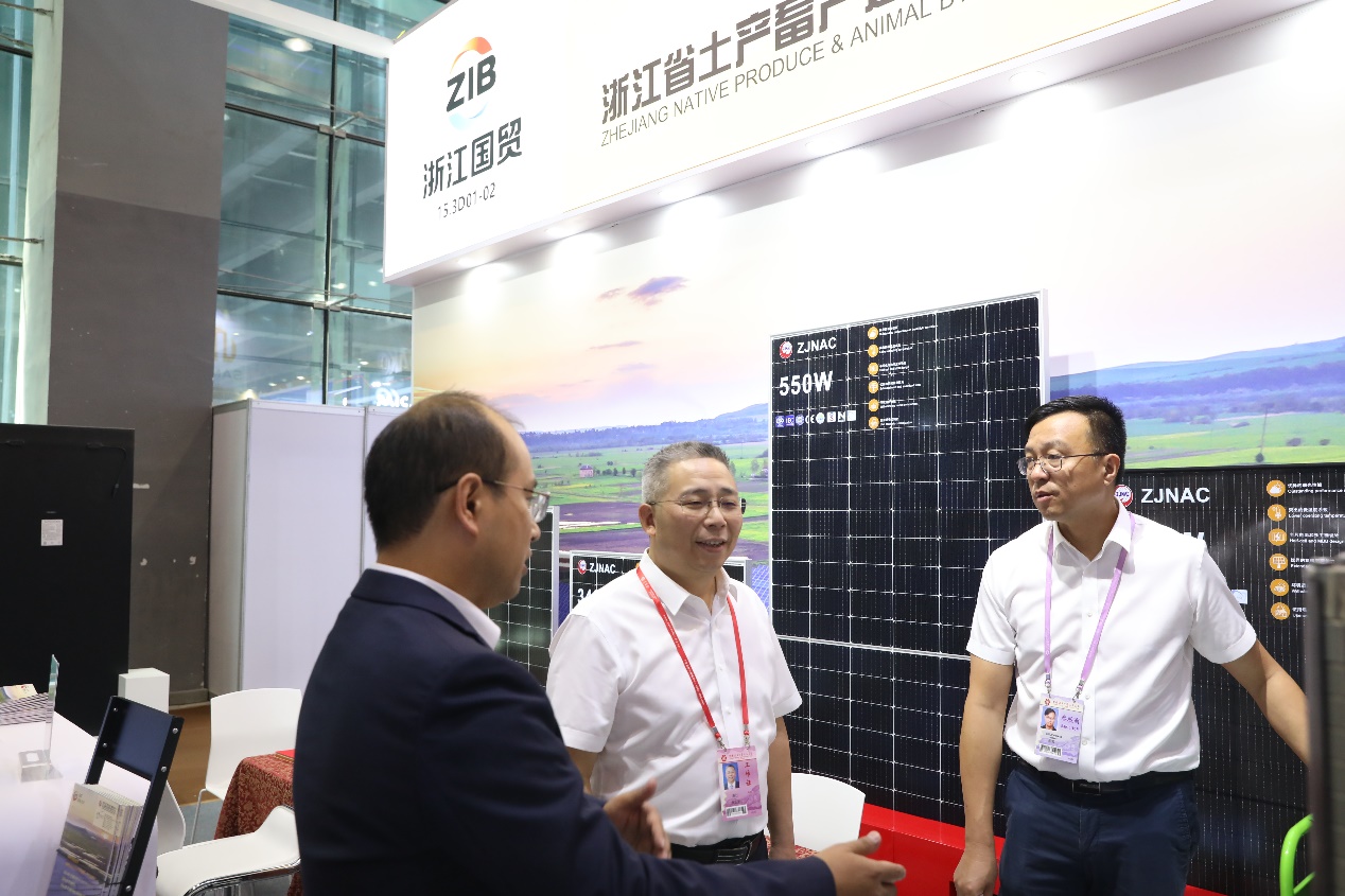 在第一期廣交會上,浙江土畜包括下屬輕工、盛力公司共有工具、五金、新能源等在內(nèi)的29個展位。公司老牌出口拳頭產(chǎn)品的漆刷展位積極順應(yīng)綠色環(huán)保發(fā)展趨勢,帶來了用回收材料制成的油漆滾筒刷,并攜此產(chǎn)品參加了本屆廣交會新品發(fā)布活動。新能源展位作為新質(zhì)生產(chǎn)力產(chǎn)品開發(fā)前線,其光伏組件產(chǎn)品吸引了大量外商駐足和洽談。