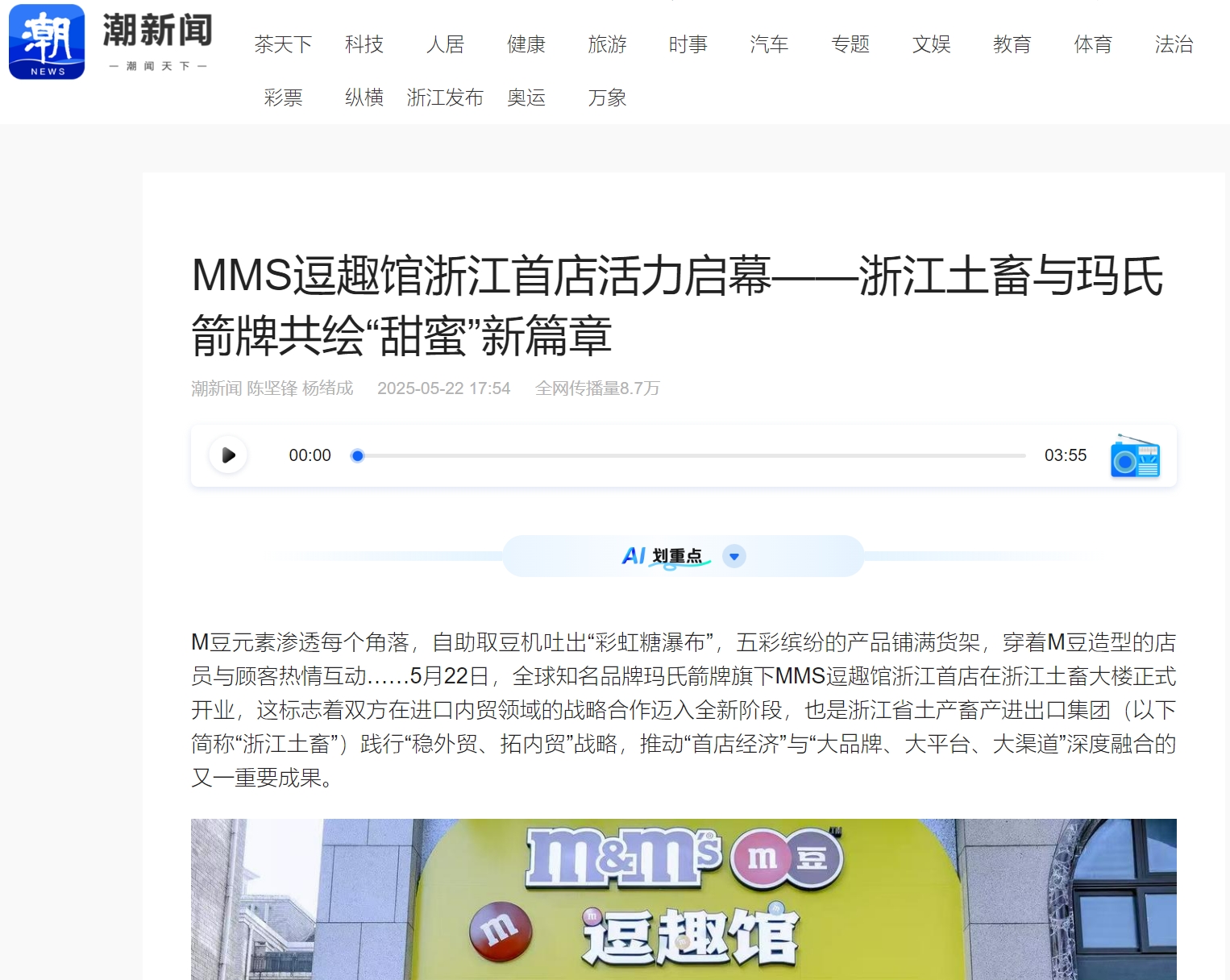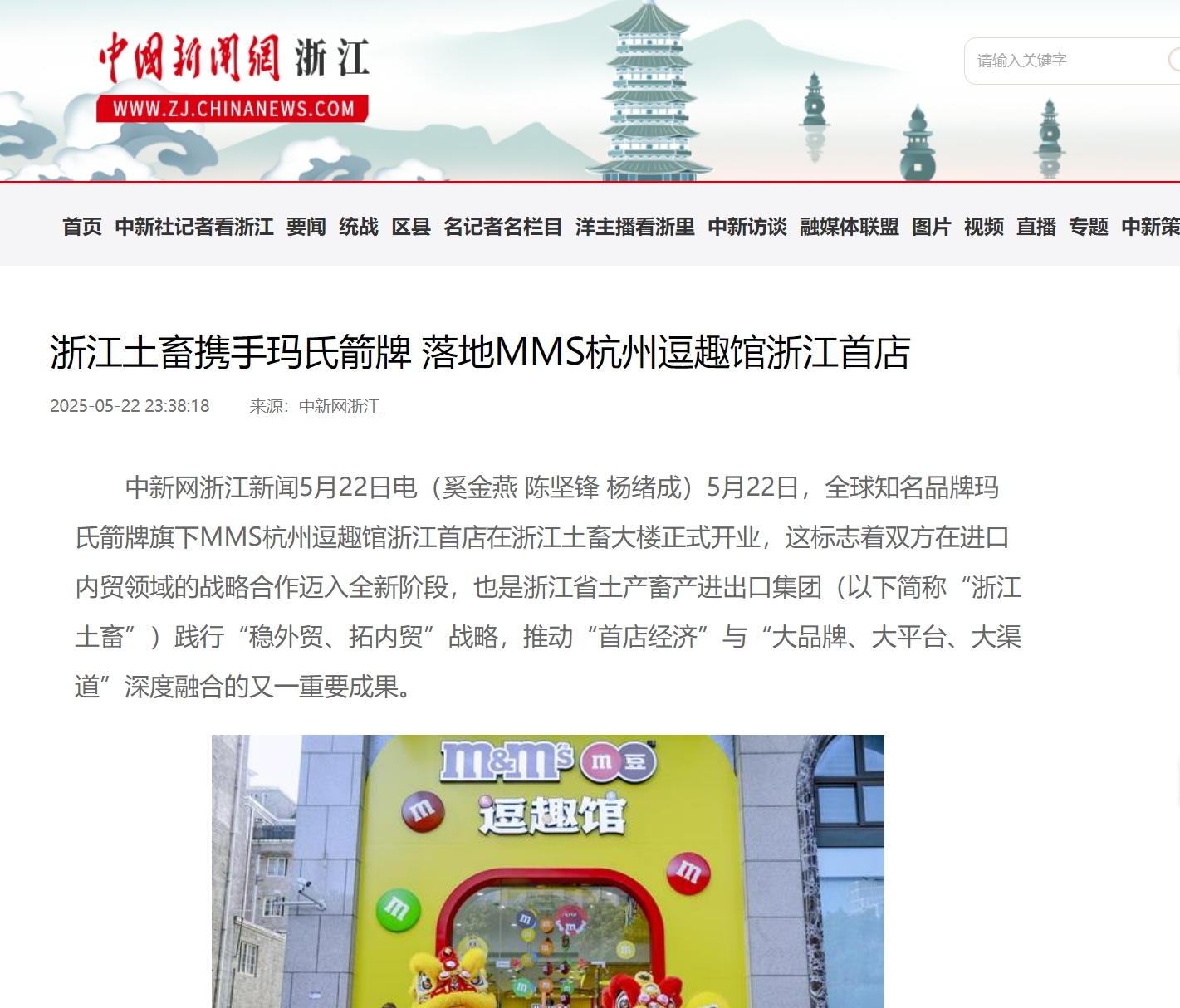 5月22日,全球知名品牌瑪氏箭牌旗下MMS逗趣館浙江首店在浙江土畜大樓正式開業,這標志著雙方在進口內貿領域的戰略合作邁入全新階段,也是浙江省土產畜產進出口集團踐行“穩外貿、拓內貿”戰略,推動“首店經濟”與“大品牌、大平臺、大渠道”深度融合的又一重要成果。MMS逗趣館浙江首店落地獲中新社浙江分社、潮新聞、今日長三角等多家媒體關注報道。