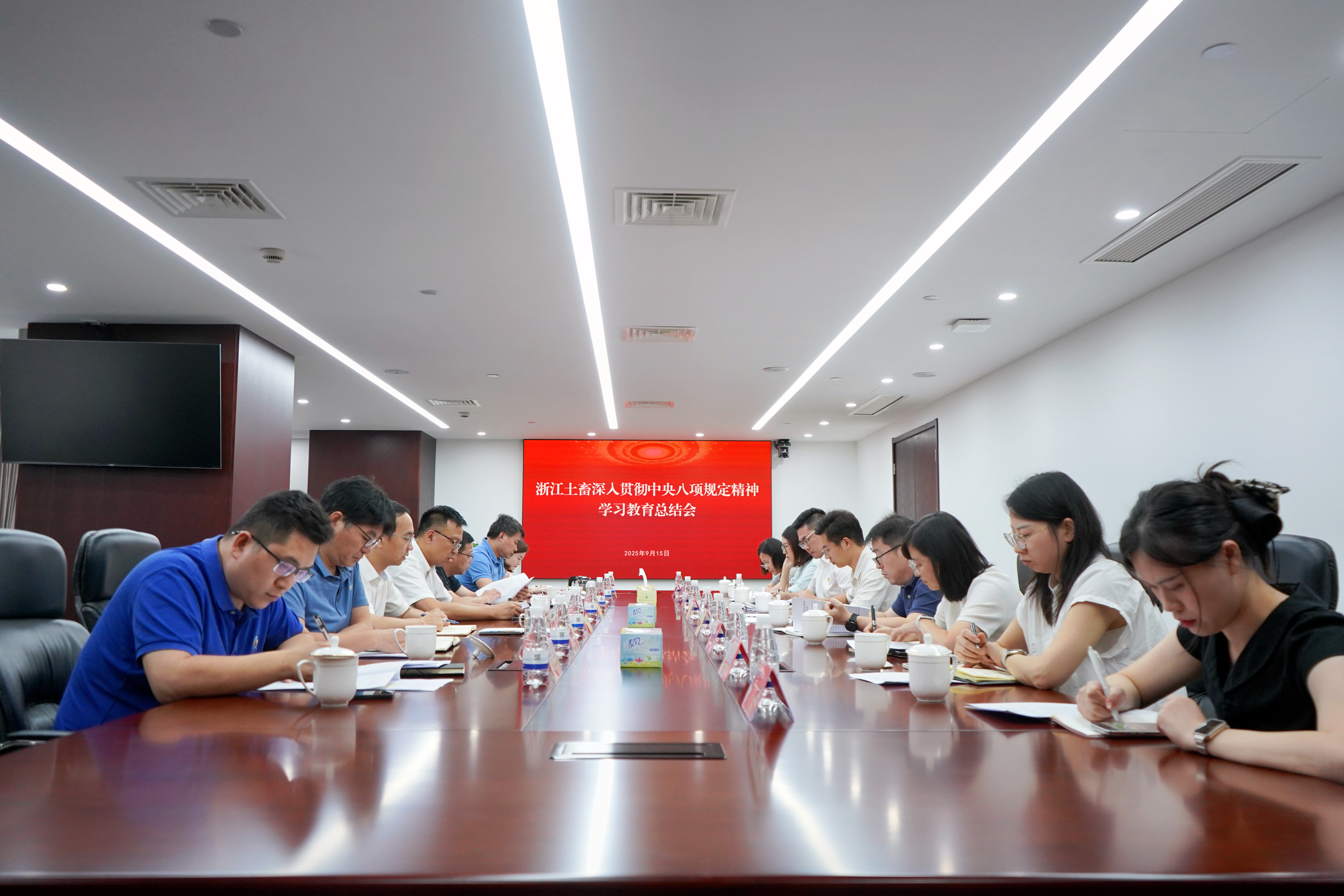 9月15日下午,浙江土畜黨委召開深入貫徹中央八項規定精神學習教育總結會,傳達學習習近平總書記關于深入貫徹中央八項規定精神學習教育的重要指示精神,貫徹落實省國貿集團學習教育總結會精神,總結公司學習教育工作,研究部署鞏固拓展學習教育成果、推進作風建設常態化長效化工作。公司黨委書記、董事長張斌主持會議并講話,各支部書記、相關職能管理部室負責人參加會議。