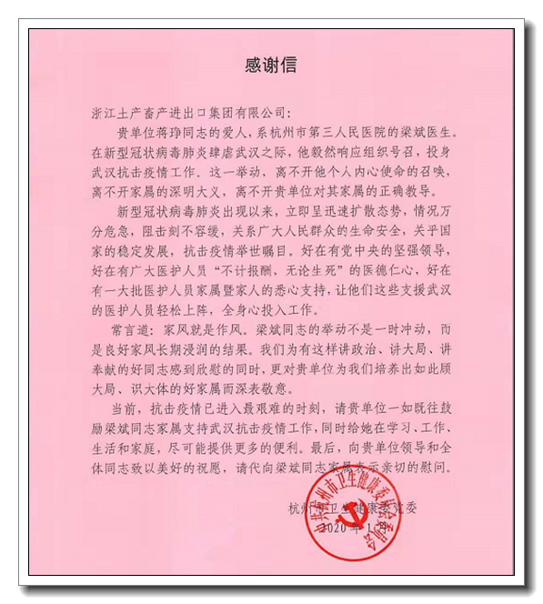 辦公室蔣琤同志舍小家顧大家,鼓勵丈夫、杭州市第三人民醫院的梁斌醫生積極響應組織號召,趕赴武漢投身到抗擊疫情的戰斗中去,得到了杭州市衛健委的高度贊揚。