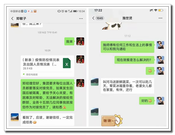 在疫情防控升級的第一時間,各支部就積極響應黨委號召,組織黨員關心關愛疫情嚴重地區的員工健康和生活情況。目前公司43位疫情嚴重地區員工、40位國外返回人員以及20位準備出國人員全部落實了對接黨員,確保每一位自我隔離的員工在遇到困難時,組織能夠第一時間發現并給予幫助。