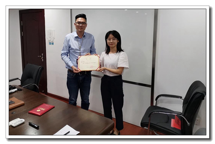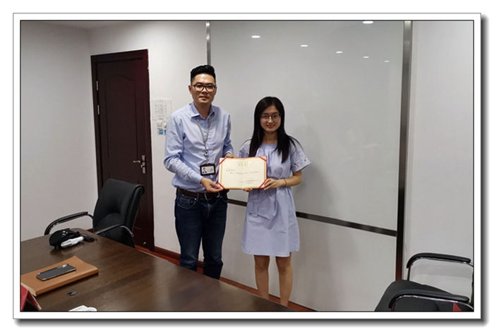 人力資源部孫陽(yáng)瑯向鄭夢(mèng)莎頒發(fā)優(yōu)秀學(xué)員證書