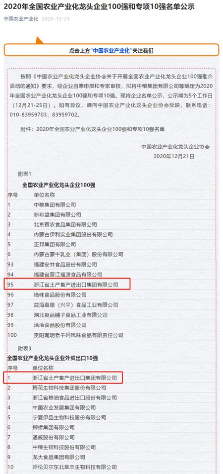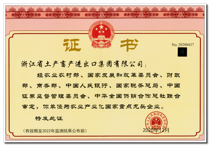 近期,經(jīng)農(nóng)業(yè)農(nóng)村部等八部委聯(lián)合審定,浙江土畜順利通過了第九次農(nóng)業(yè)產(chǎn)業(yè)化國家重點龍頭企業(yè)監(jiān)測,并從全國1120家國家重點龍頭企業(yè)中脫穎而出,被中國農(nóng)業(yè)產(chǎn)業(yè)化龍頭企業(yè)協(xié)會授予“2020年全國農(nóng)業(yè)產(chǎn)業(yè)化龍頭企業(yè)100強(qiáng)”和“外貿(mào)出口10強(qiáng)”兩項榮譽(yù)。