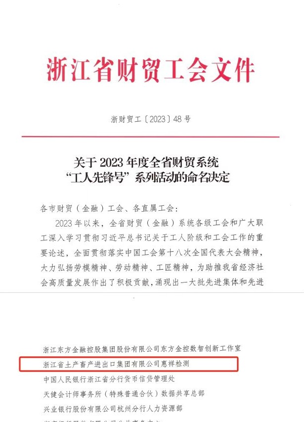 近日,浙江土畜惠祥檢測班組以其專業、優質、高效的檢測服務,創新、務實、奮斗的團隊精神,榮獲2023年度浙江省財貿工會“工人先鋒號”稱號。