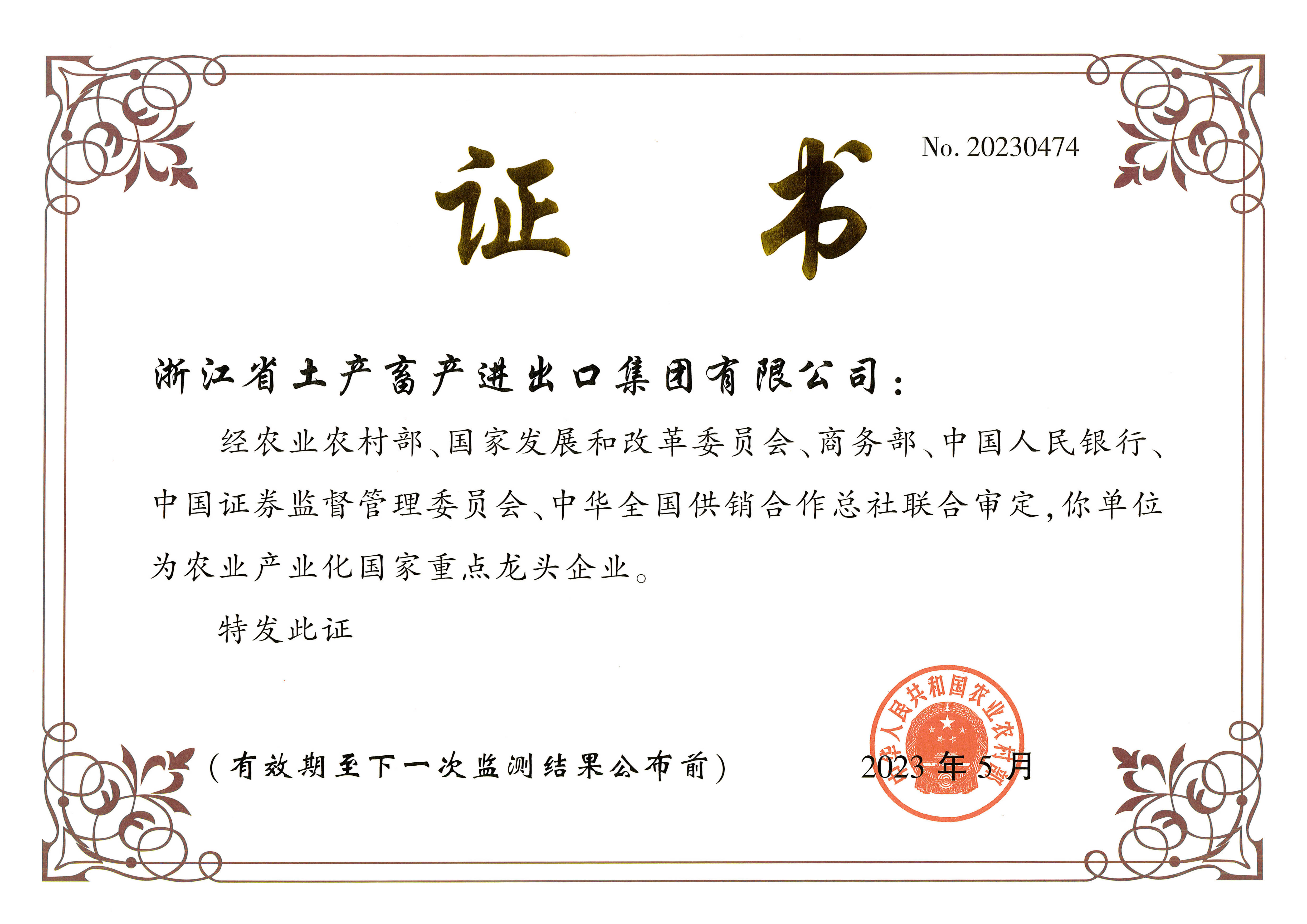 5月,經農業農村部等八部委聯合審定,浙江土畜第六次通過了農業產業化國家重點龍頭企業監測,展現出對企業經營成績及在產業振興、行業帶動、聯農助農等方面工作的認可,也激勵公司上下為全面推進鄉村振興、加快建設農業強國貢獻更多力量。